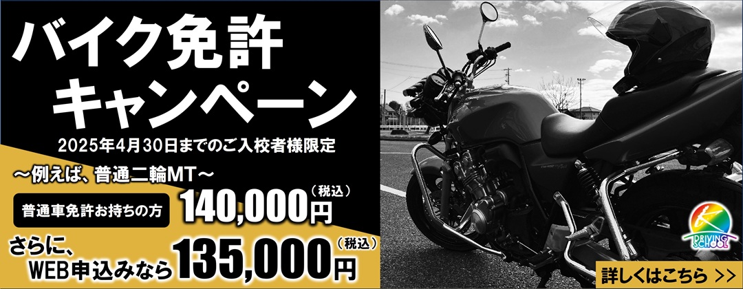 【適用条件】対象は59歳以下の方。普通二輪免許は普通車免許を保有の方。大型二輪は普通二輪免許を保有の方。※キャンペーンは予告なく変更する場合がございますので、予めご了承ください。