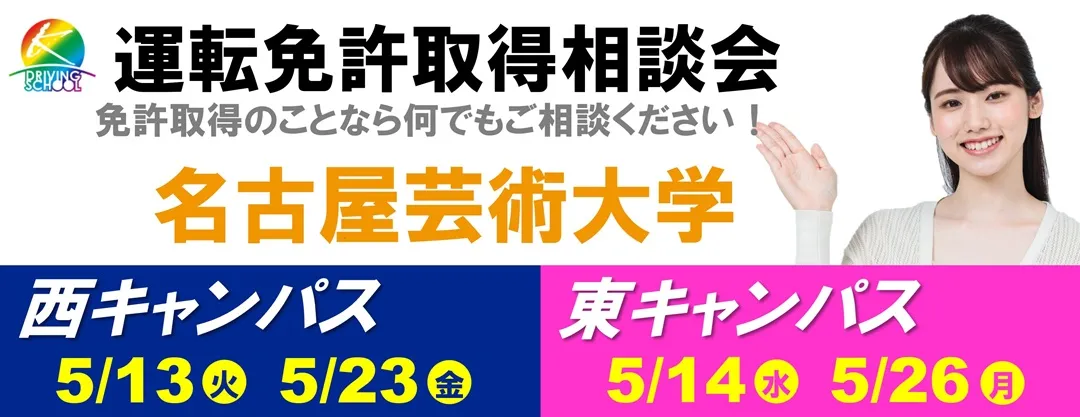 江南自動車学校では、名古屋芸術大学において運転免許取得相談会を実施しています。下記の日程にて実施しておりますので、お気軽にご相談ください。 2025年度 相談会日程 東キャンパス(食堂内) 5/14(火)・5/26(月) […]