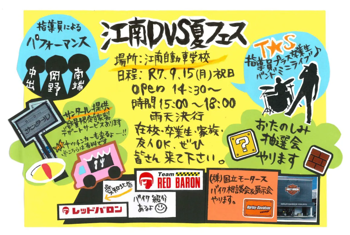 2025年9月15日 江南自動車学校にて、在校生・卒業生とそのご家族・友人に向けた熱い時間がやってくる!! 指導員と卒業生で結成されたバンドのミニライブ、指導員によるパフォーマンス! オムライス屋さんの「サンタール」さ […]