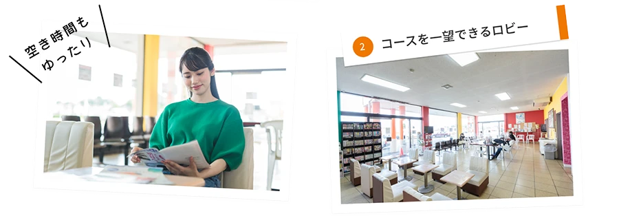 コースを一望できるロビーがあり教習の空き時間もゆったり過ごせるよう雑誌やマンガを取り揃えております。